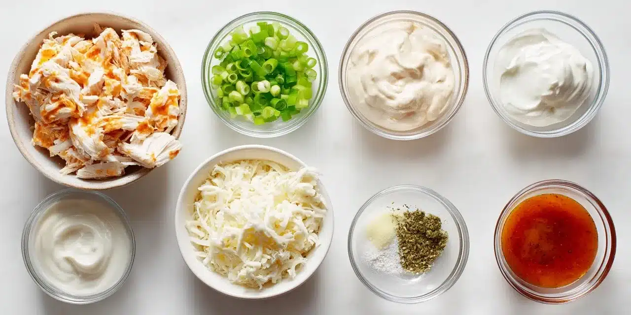 It starts with a few smart swaps: Greek yogurt instead of sour cream, light cream cheese, and part-skim mozzarella for that creamy melt without the grease. This healthy chicken wing dip recipe also skips bottled dressings and uses seasoning blends for flavor without extra fat. And don’t forget—shredded chicken breast adds lean, filling protein.